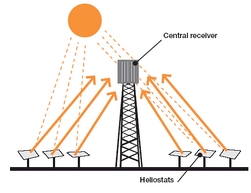 Consiste en un campo solar integrado por helióstatos (grandes espejos de seguimiento individual)  que se utilizan para concentrar la luz solar en un receptor central situado en la parte superior de una torre. Un medio de transmisión de calor situado en este receptor central absorbe la radiación muy concentrada reflejada por los helióstatos y la transforma en energía térmica con objeto de generar vapor, el cual se expande en una turbina acoplada a un generador para la producción de electricidad.