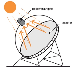 Un reflector  con forma de antena parabólica se utiliza para concentrar la luz solar en un receptor situado en el punto focal del plato.